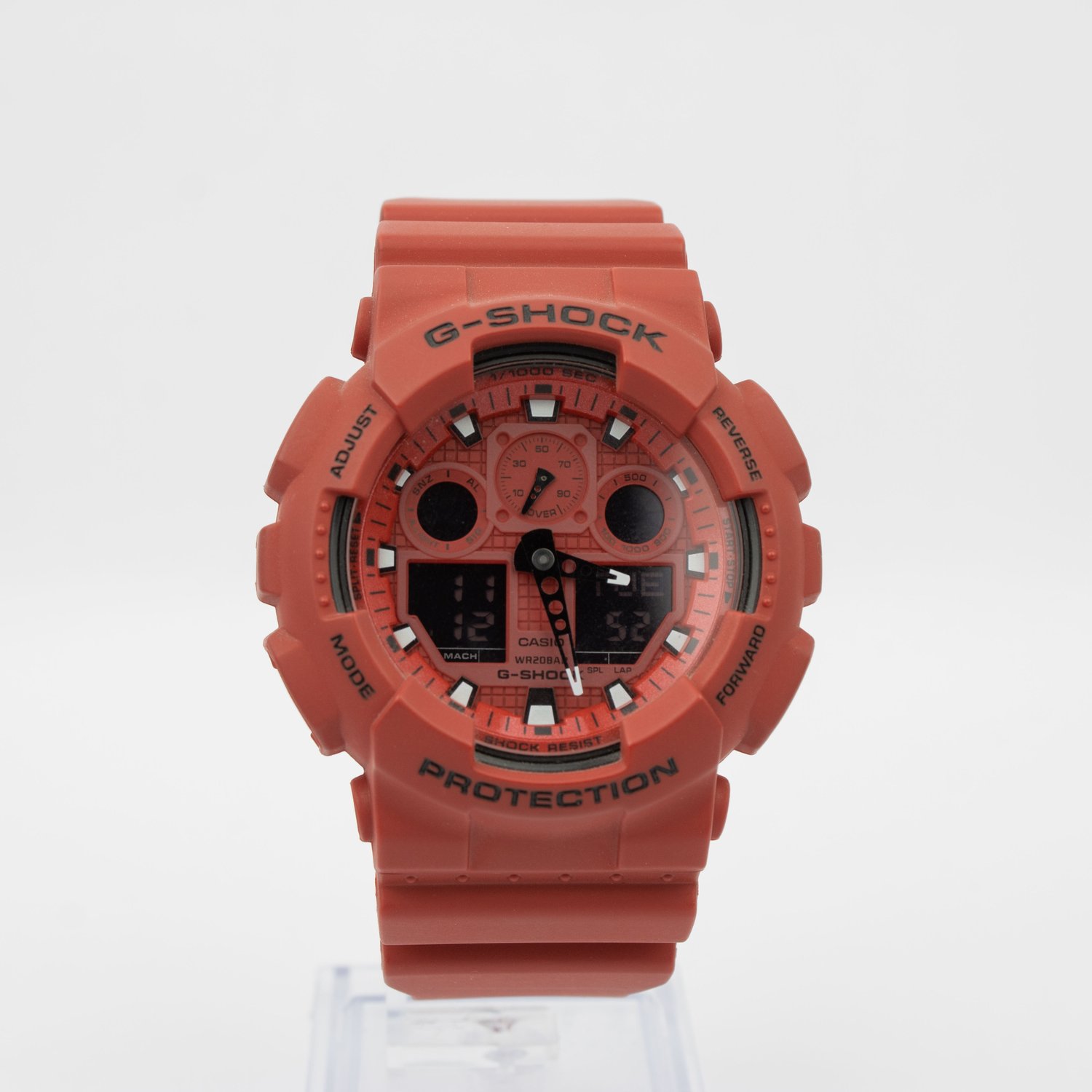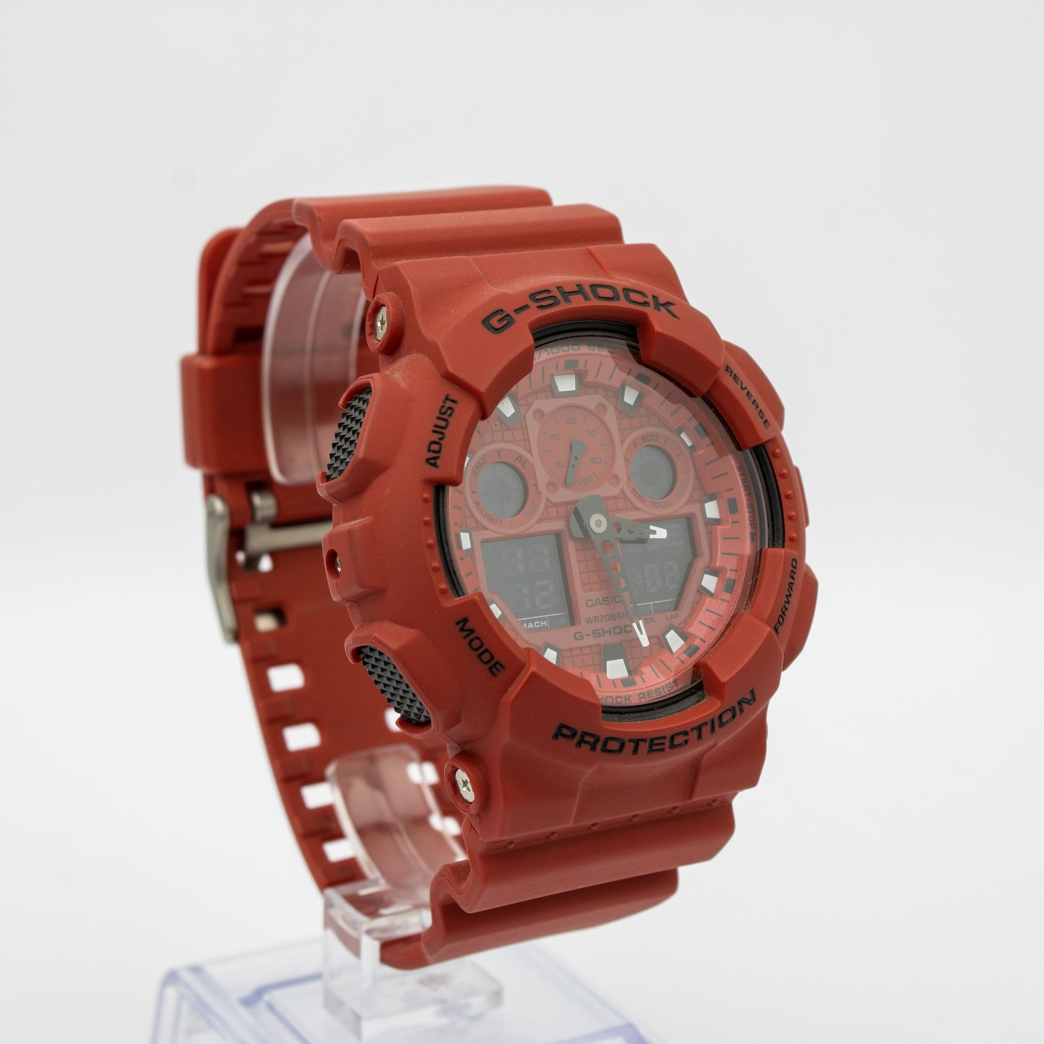 Apresentamos o relógio masculino G-Shock, referência GA-100C. Com caixa e pulseira de borracha na cor vermelho, seu design imponente possui diâmetro de 50mm e espessura de 16mm. O mostrador vermelho destaca o display, enquanto o cristal mineral protege. Resistente à água até 200m, garantia de 1 ano. Acompanha estojo. Sofisticação e funcionalidade em um único acessório.
