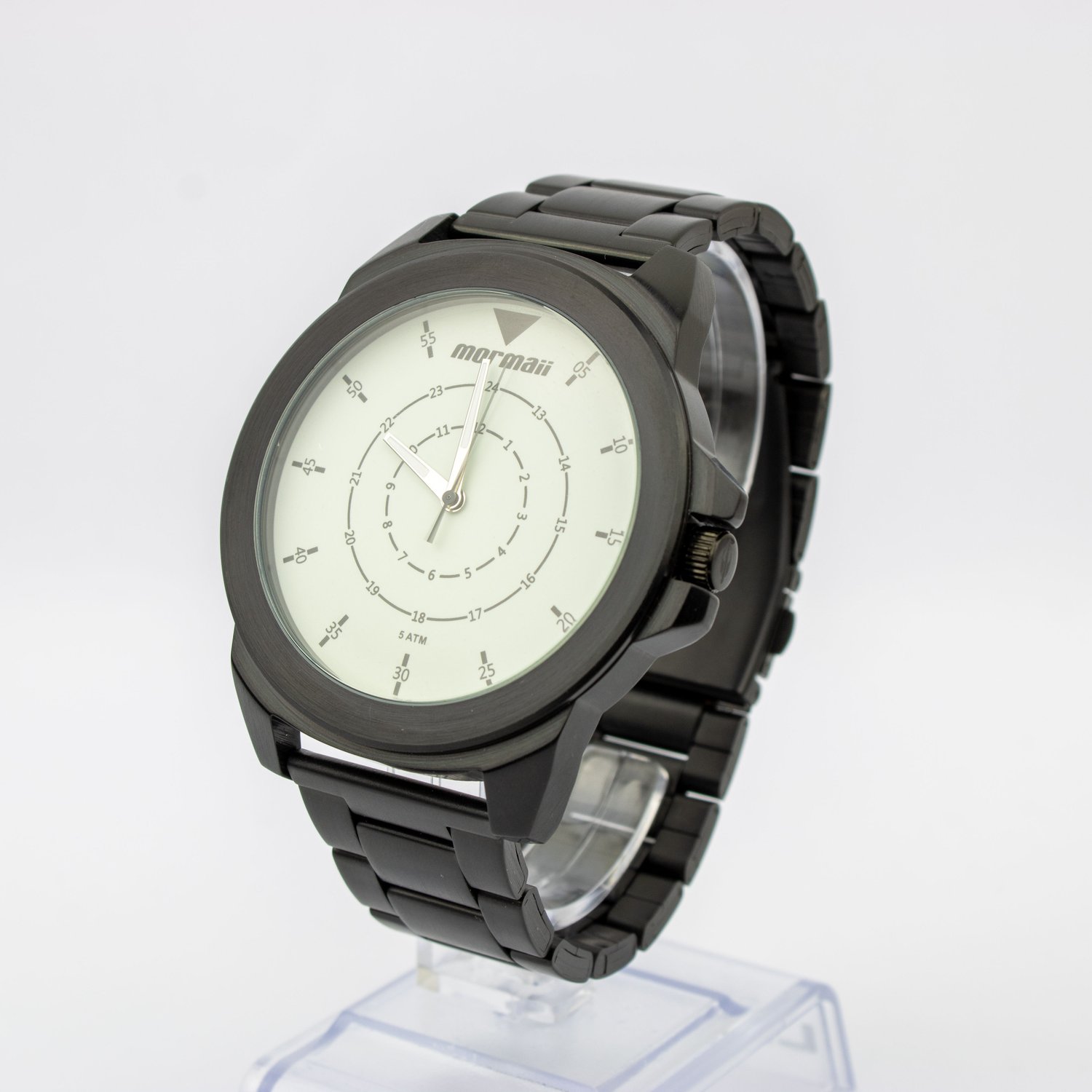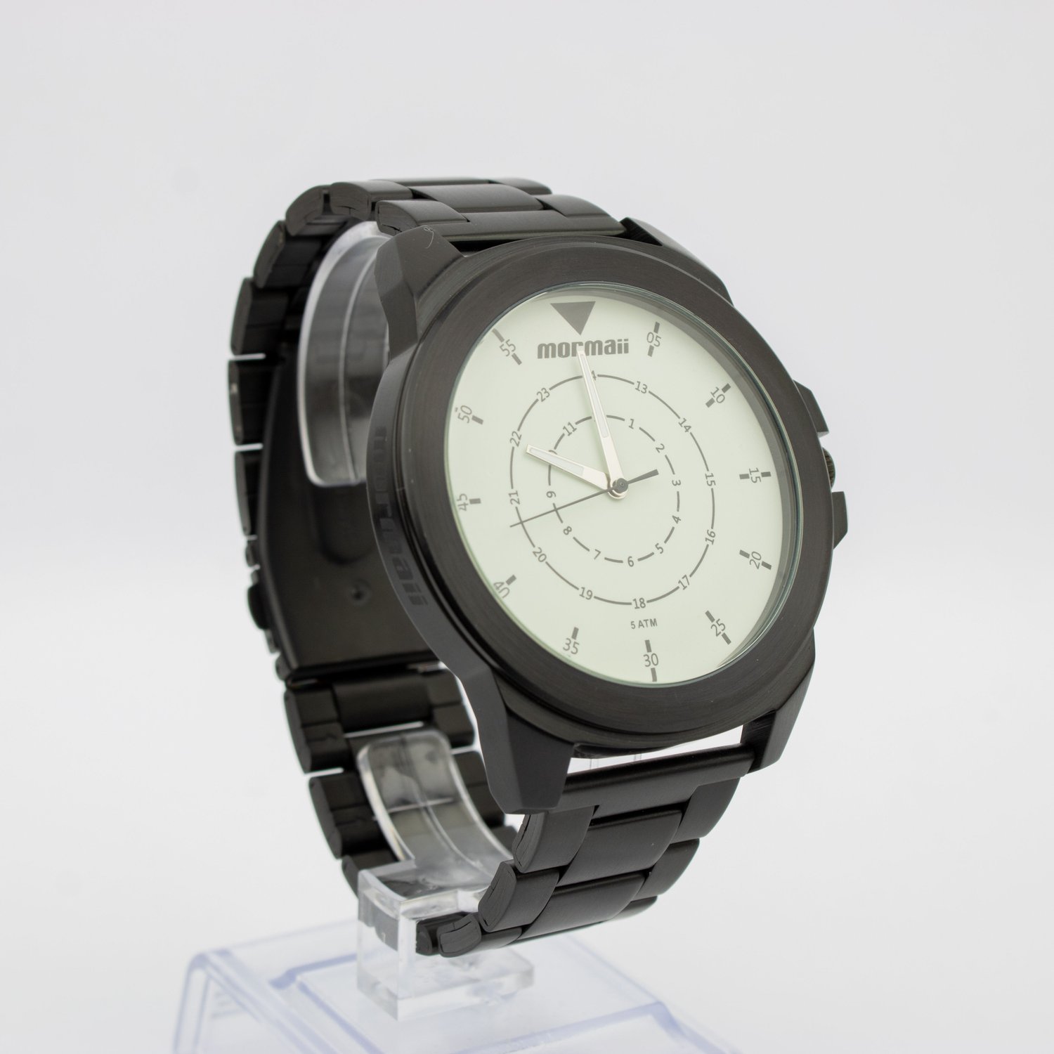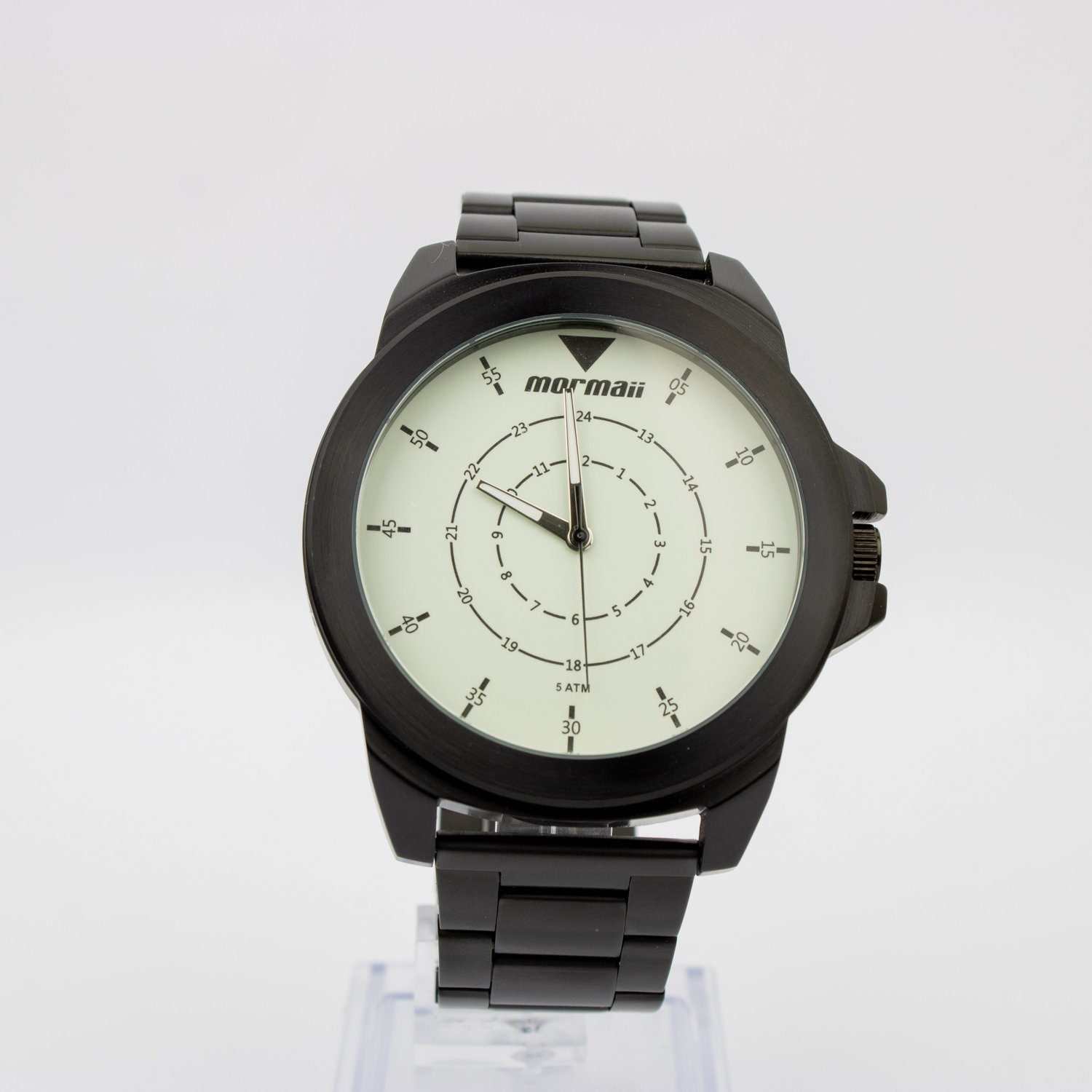 Apresentamos o relógio masculino Mormaii, referência MO2035JR. Com caixa e pulseira em aço na cor preto, seu design imponente possui diâmetro de 53mm e espessura de 10mm. O mostrador branco fosforescente destaca o relógio, enquanto o cristal mineral protege. Resistente à água até 50m, garantia de 1 ano. Acompanha estojo. Sofisticação e funcionalidade em um único acessório.